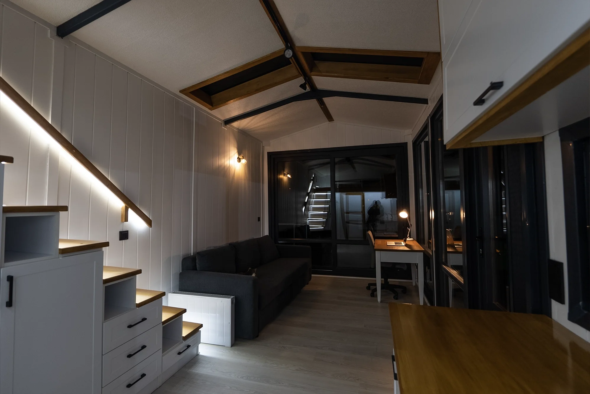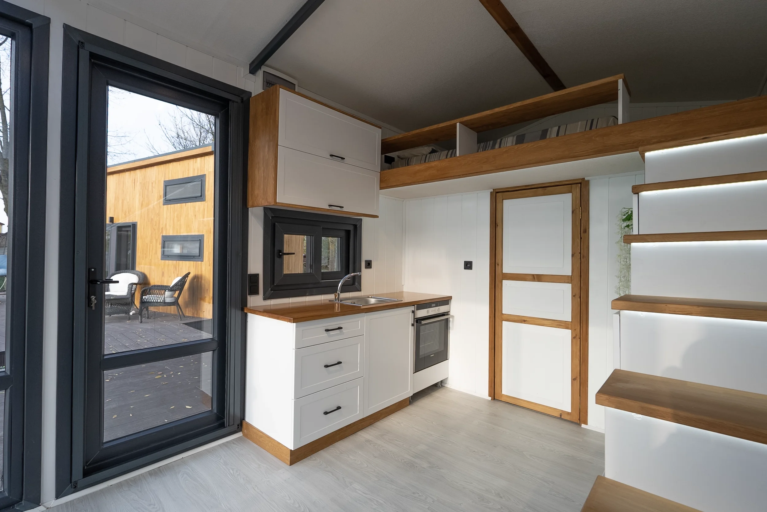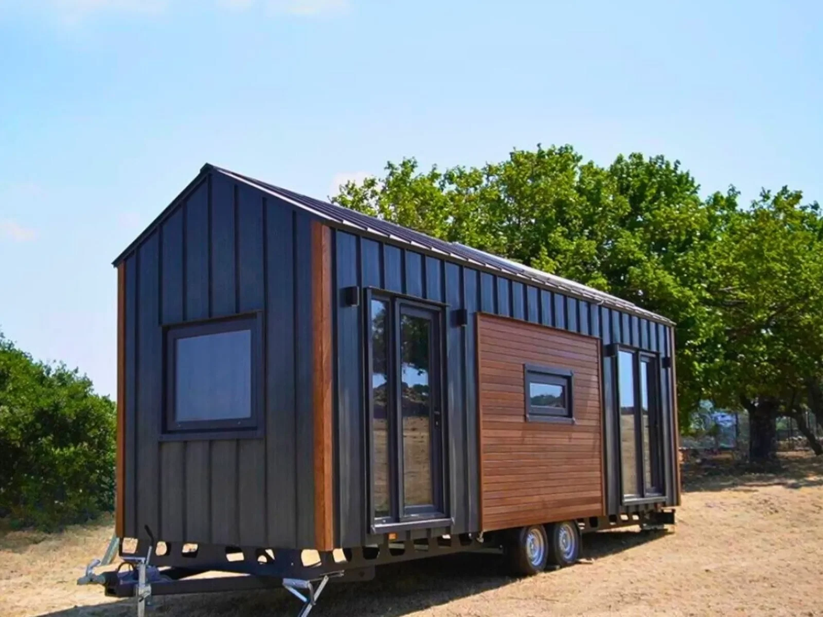 Longrider – Ein kompaktes Tiny House auf Rädern mit zwei Etagen. Die Außenverkleidung kombiniert Massivholz mit Metall und verfügt über bodentiefe Fenster sowie eine doppelflügelige Glastür mit Sicherheitsverriegelung.