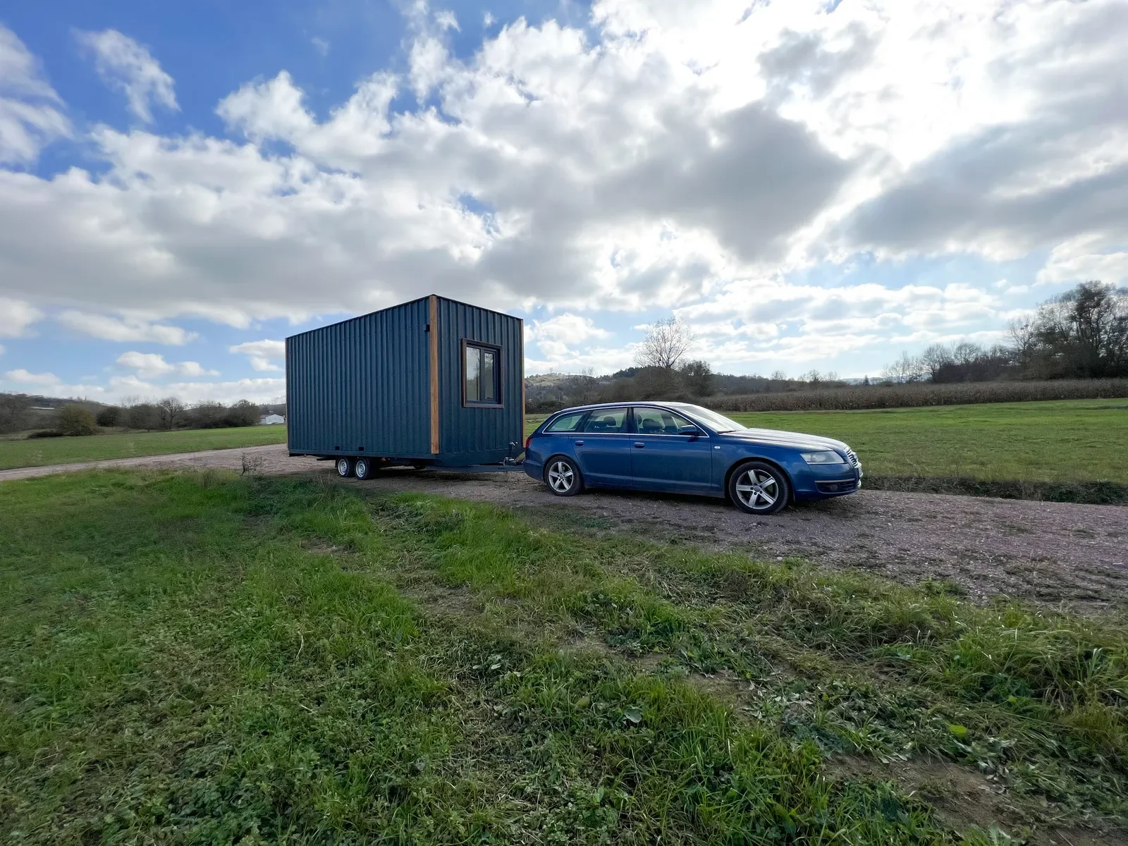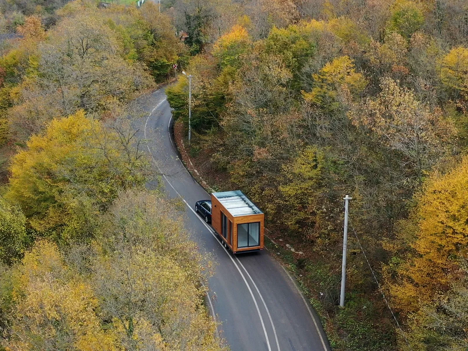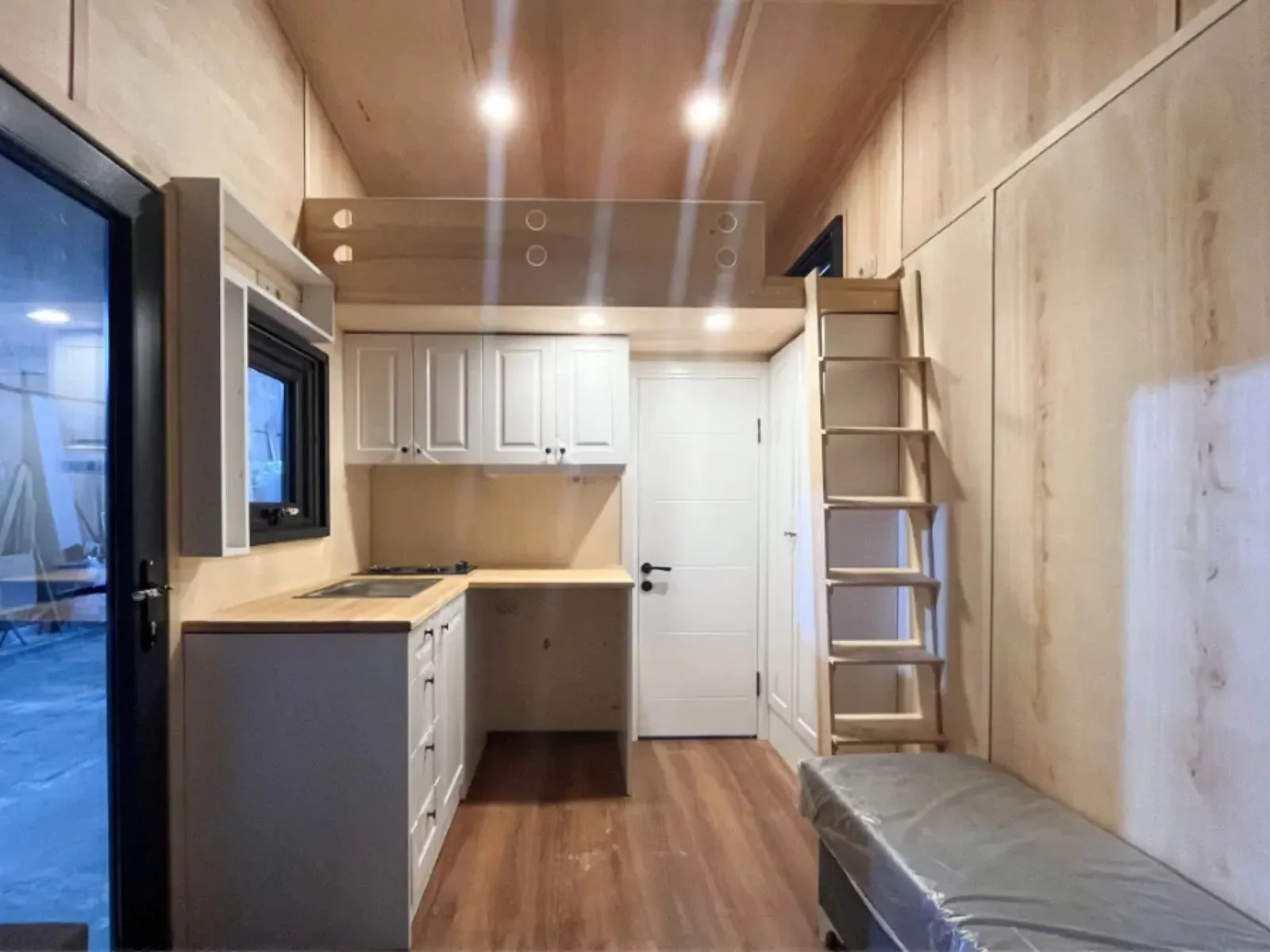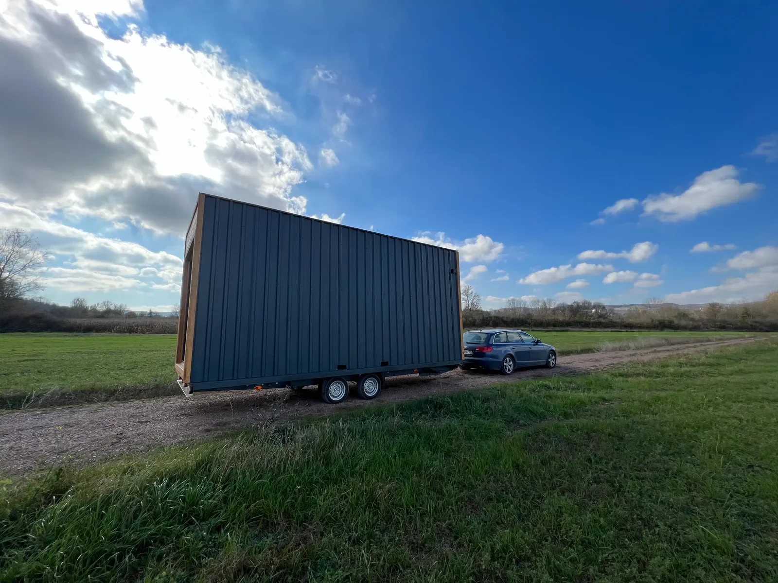 Longrider – Ein kompaktes Tiny House auf Rädern mit zwei Etagen. Die Außenverkleidung kombiniert Massivholz mit Metall und verfügt über bodentiefe Fenster sowie eine doppelflügelige Glastür mit Sicherheitsverriegelung.