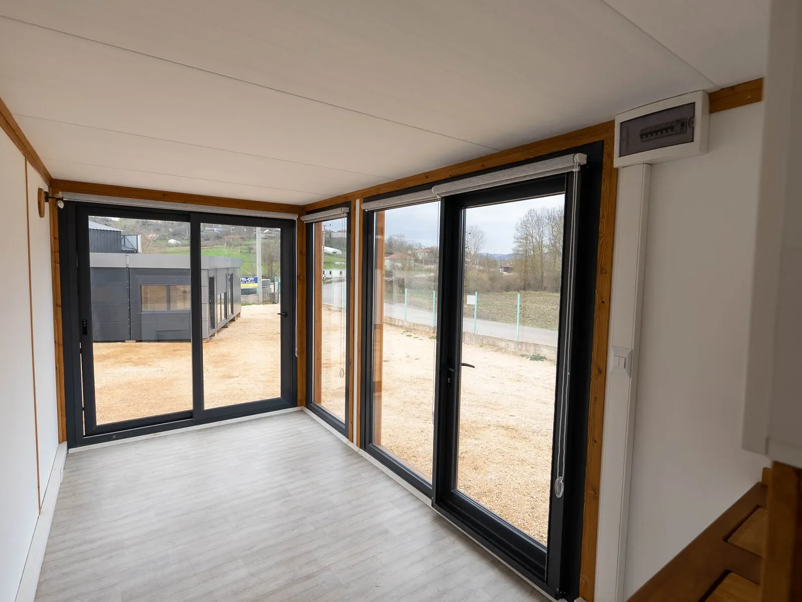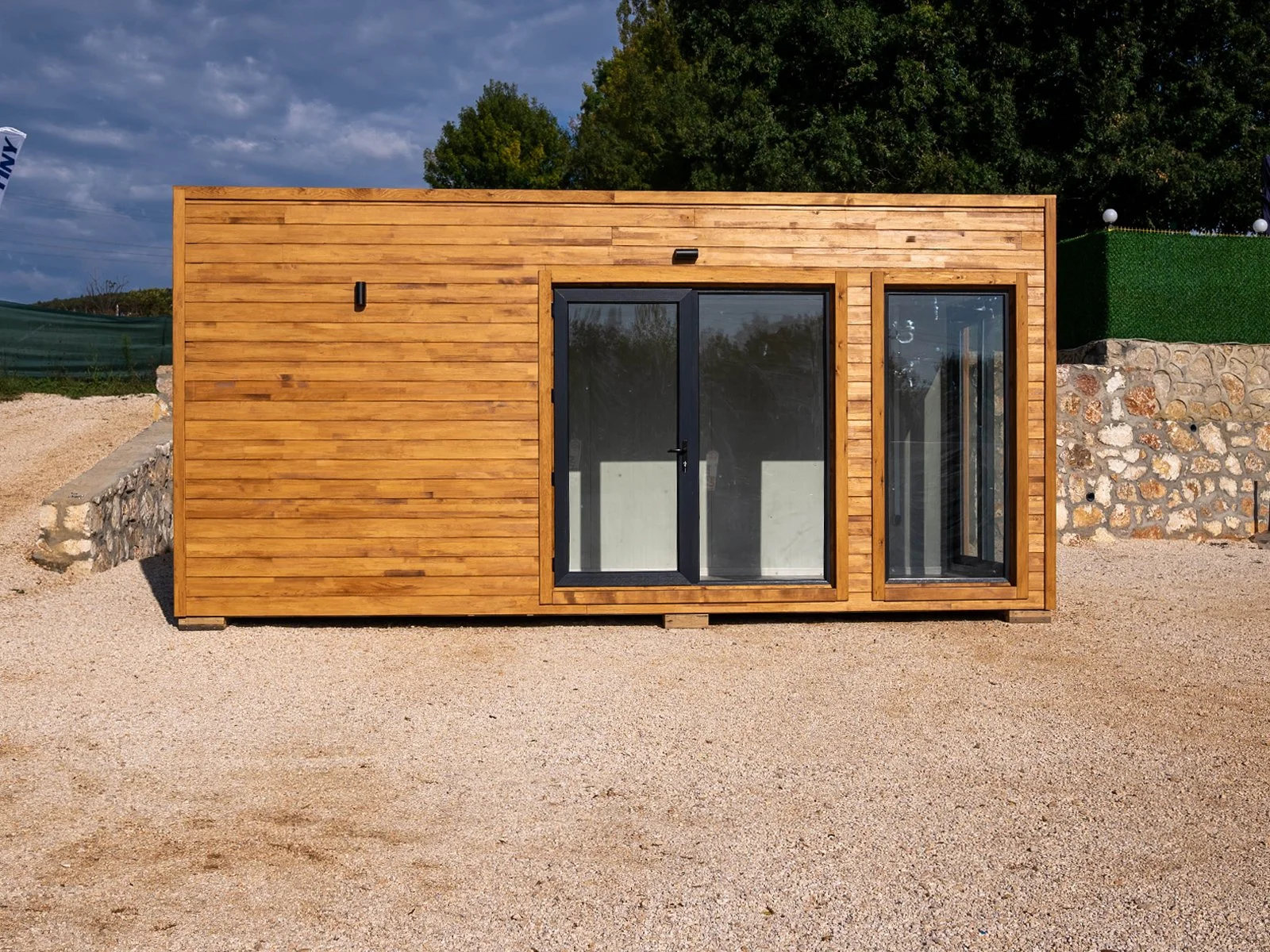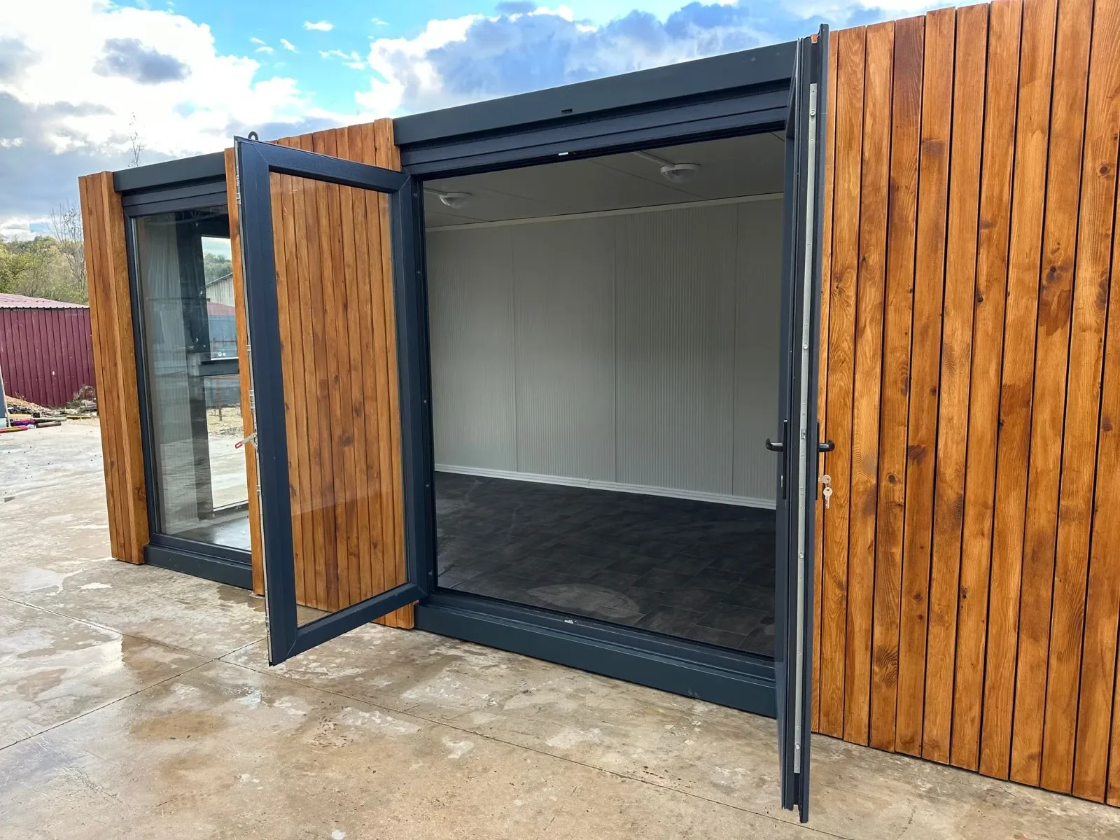 Die Kombination aus großflächigen Fenstern, warmem Holz und robustem Stahl macht dieses 3×7-Modell zu einem hellen, modernen Arbeitsplatz. Ideal für Büros, Studios oder Showrooms, die ein hochwertiges und professionelles Ambiente verlangen.