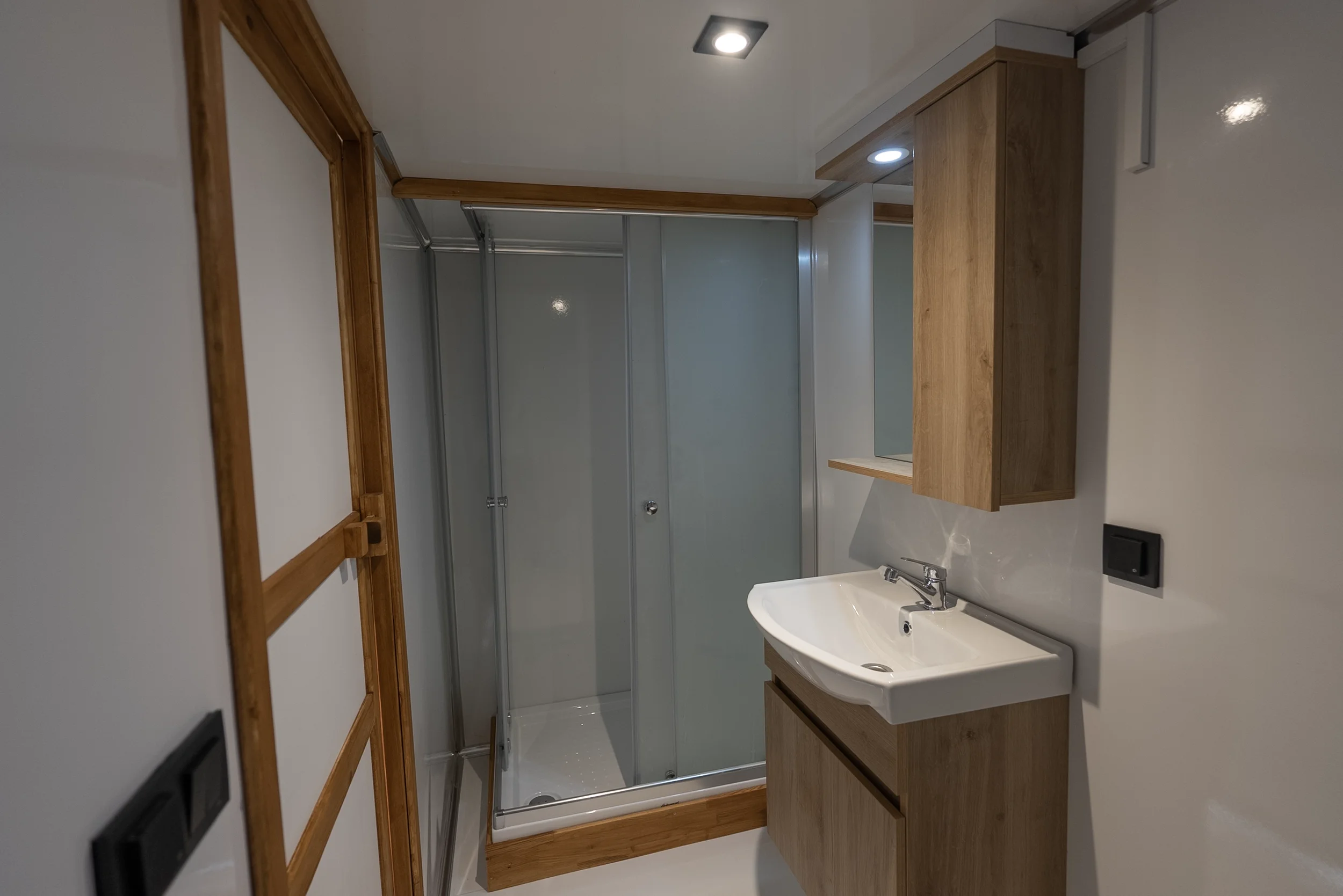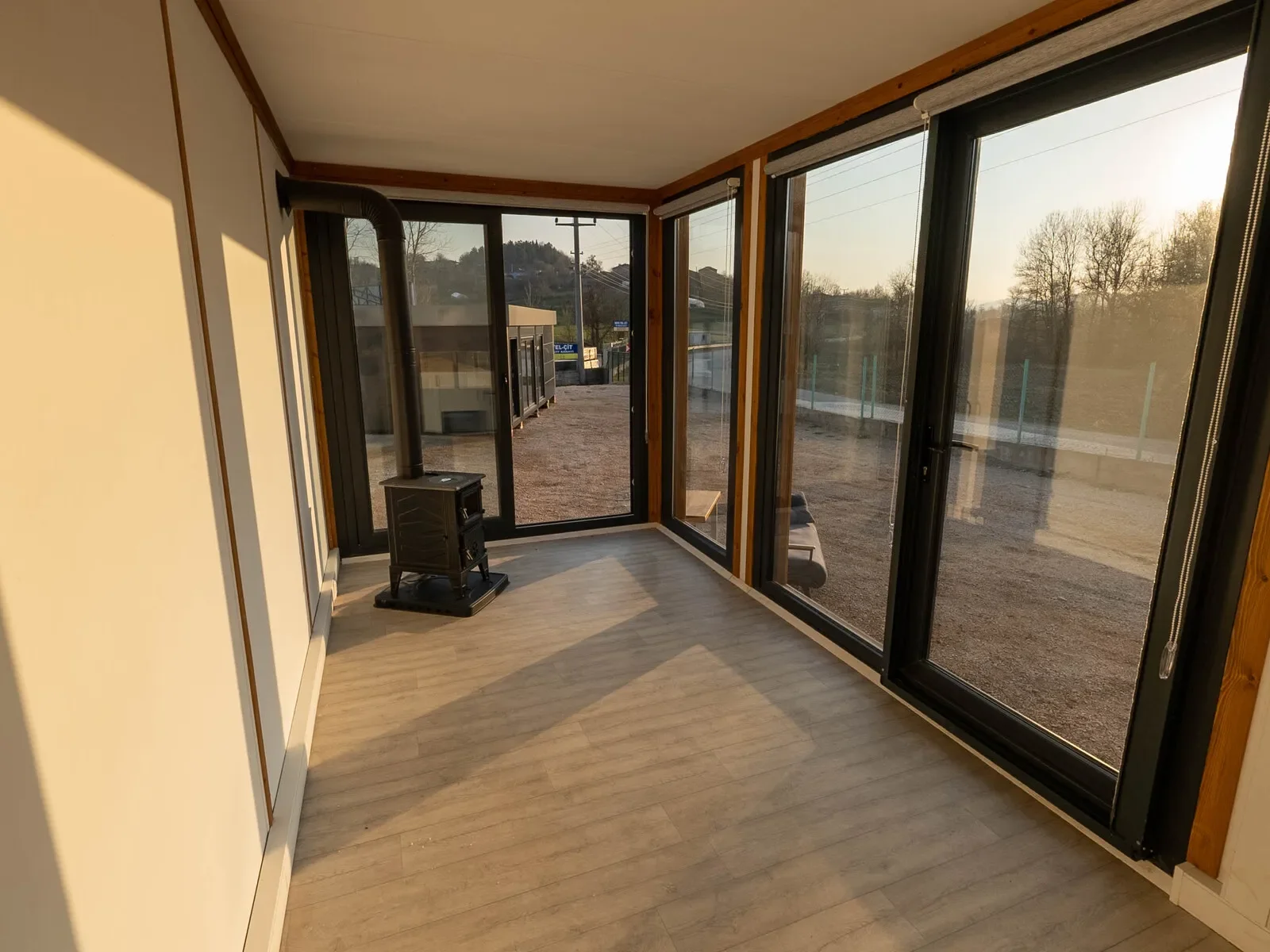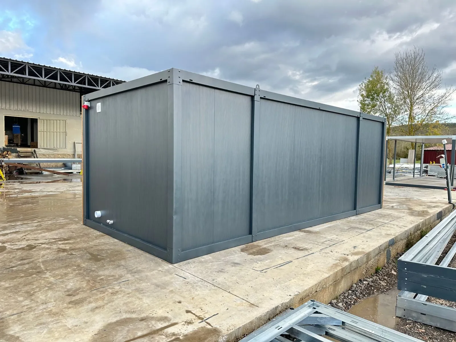 Die Kombination aus großflächigen Fenstern, warmem Holz und robustem Stahl macht dieses 3×7-Modell zu einem hellen, modernen Arbeitsplatz. Ideal für Büros, Studios oder Showrooms, die ein hochwertiges und professionelles Ambiente verlangen.