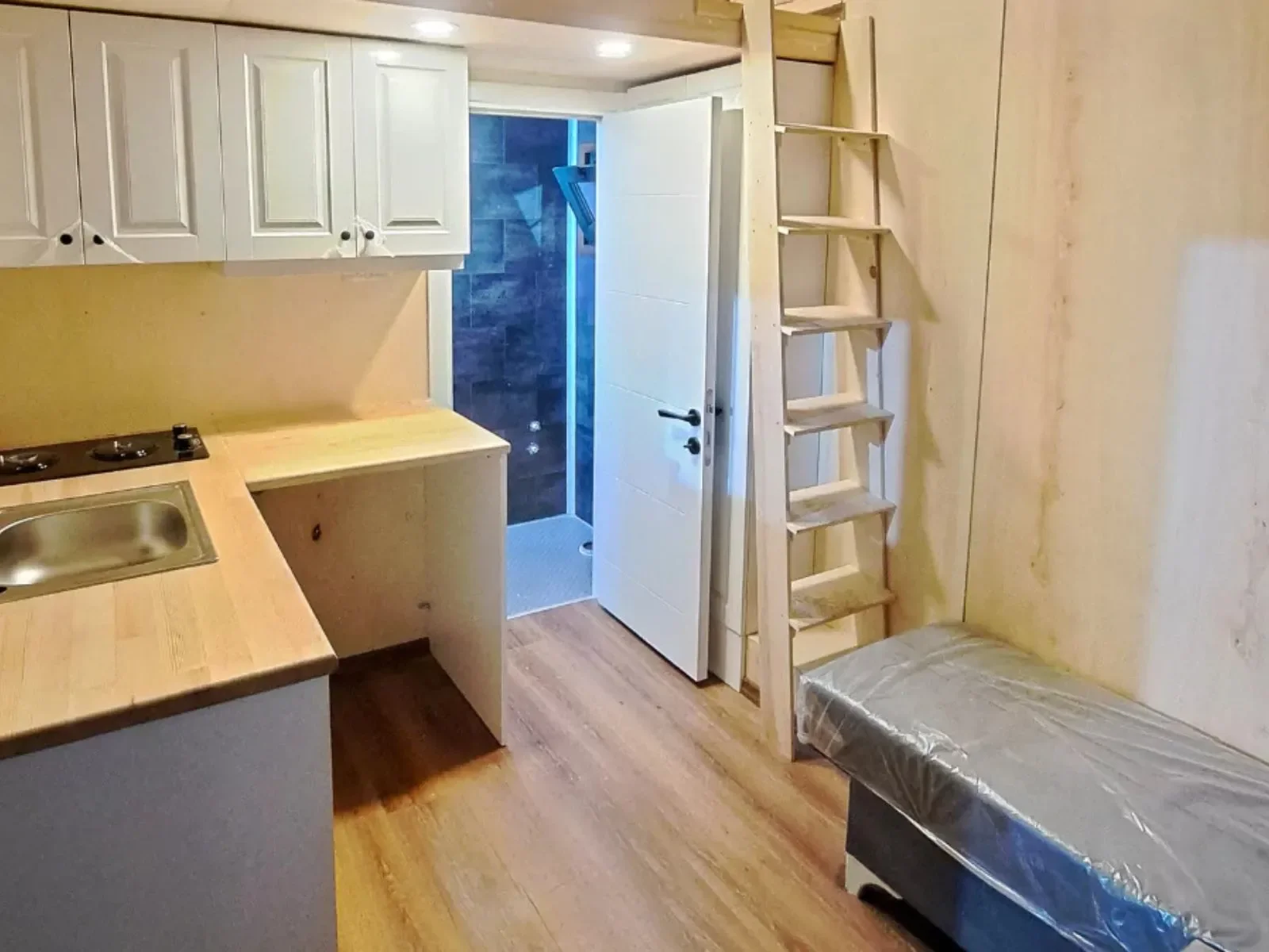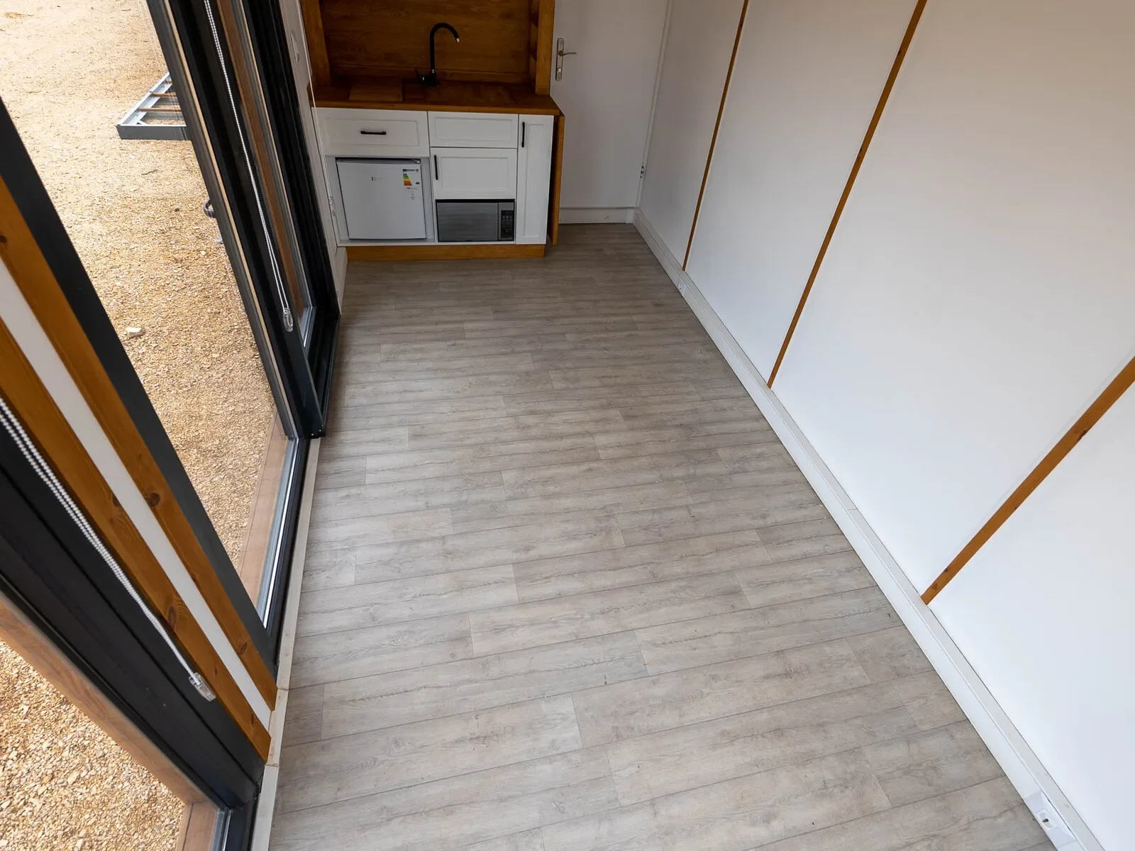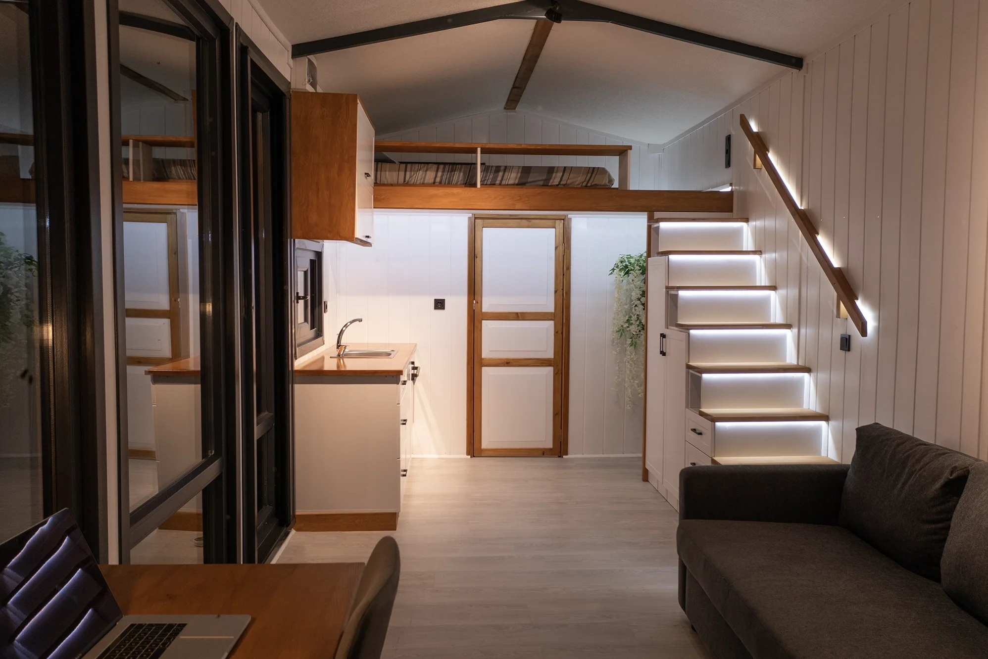 Tiny House Modell: Moonlight Premium Plus – Ein modernes Tiny House auf Rädern mit hochwertiger Massivholz-Fassade und bodentiefen Panoramafenstern. Die Doppelschiebetüren aus Sicherheitsglas sorgen für eine offene und lichtdurchflutete Atmosphäre.