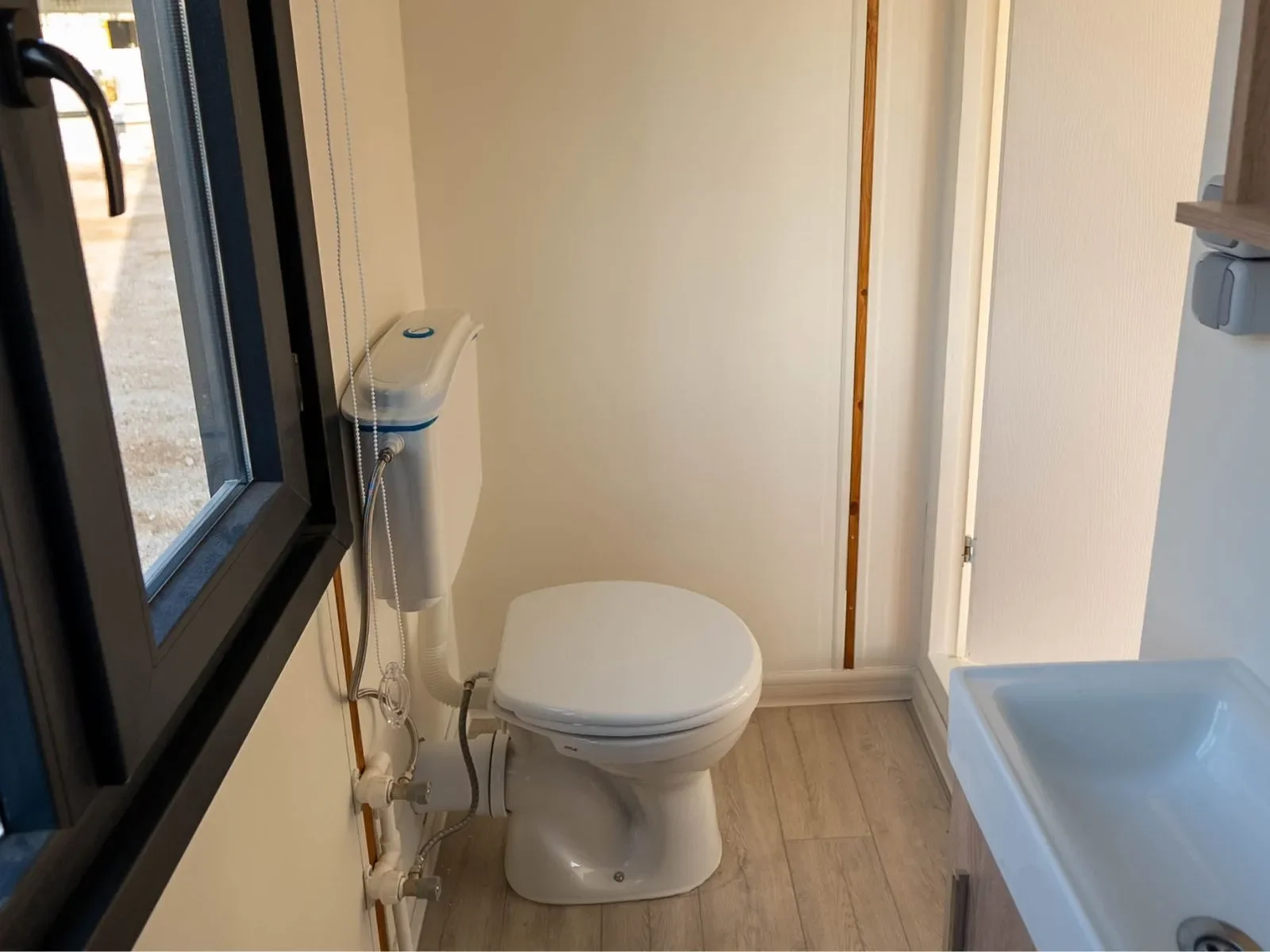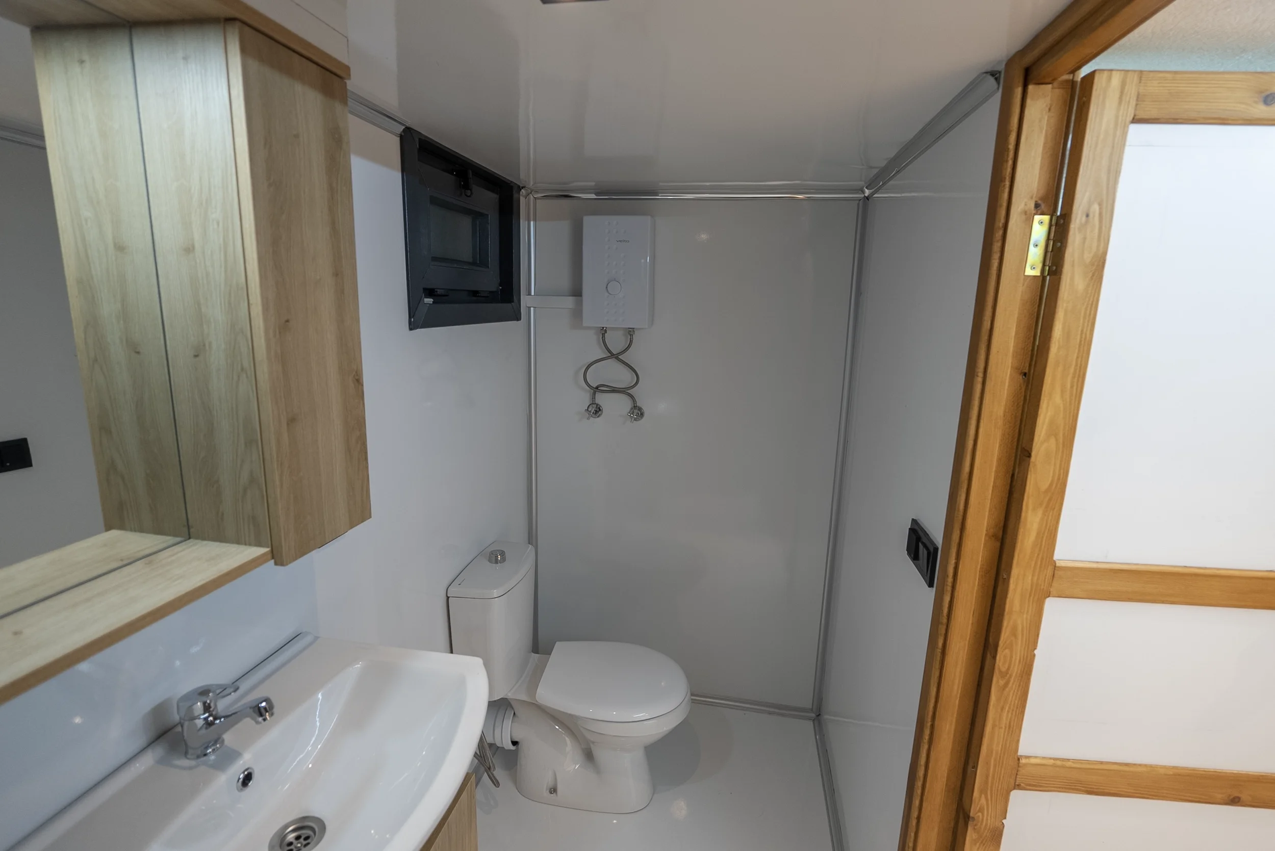 Holiday to Go – Ein kompaktes Tiny House auf Rädern mit moderner Ausstattung. Die Außenverkleidung kombiniert hochwertiges Massivholz mit Metallelementen und großen, isolierten Fenstern für viel Tageslicht.